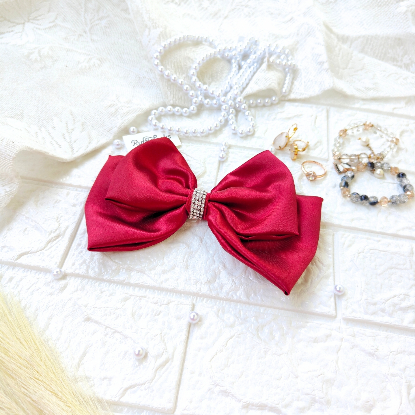 A two-layer satin hair bow with a hanging stone chain brings a touch of luxury and femininity, perfect for both casual and formal looks.